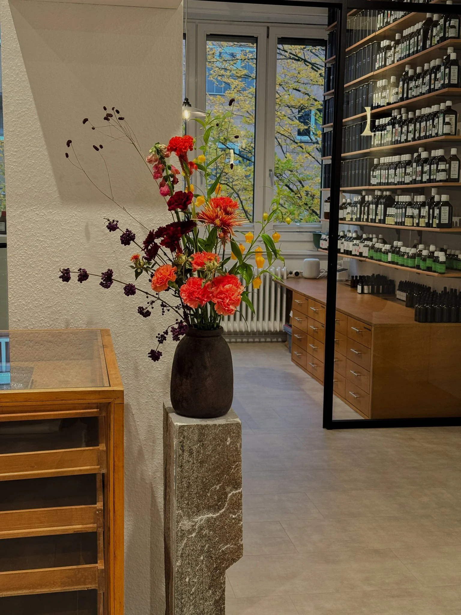 Regelmässig entstehen florale Arrangements für die Mixtura Naturheilkunde Drogerie – abgestimmt auf das feinsinnige Ambiente, in dem die Naturheilkunde bewusst gelebt und zelebriert wird.